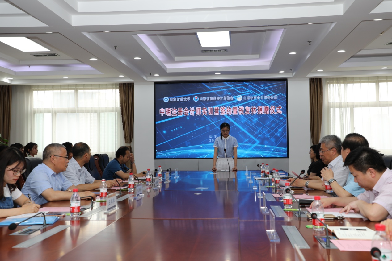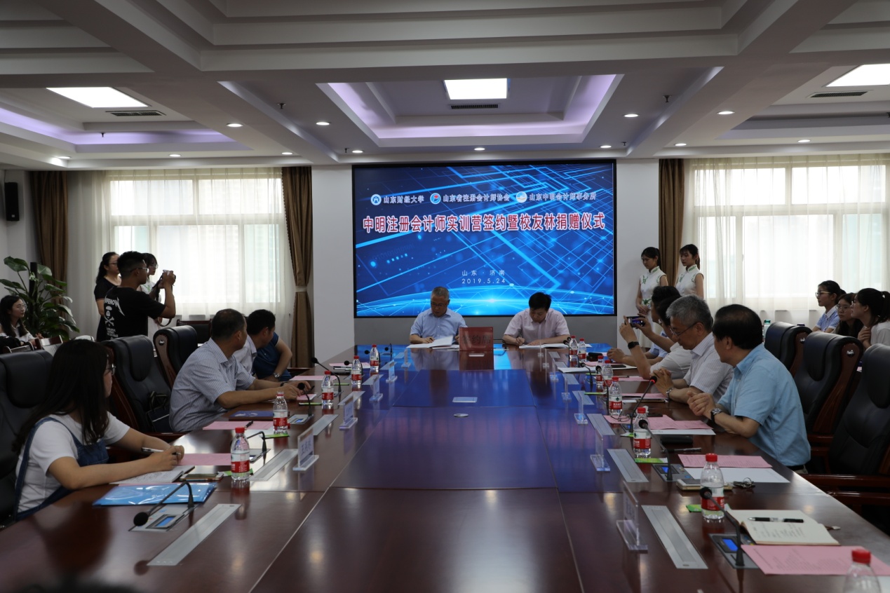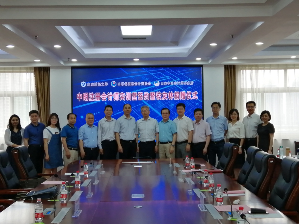 为进一步促进产学研结合,提升在校生理论联系实际能力,吸引更多的有志之士加盟注册会计师事业,为全省注册会计师行业储备人才,5月24日下午,由山东财经大学、山东省注册会计师协会和山东中明会计师事务所联合发起的山东财经大学注册会计师方向 “中明实训营”签约仪式在山东财经大学燕山校区办公楼七楼报告厅顺利举行,出席仪式的有:山东财经大学副校长张新、会计学院有关负责人及学校有关处室负责人,山东省注册会计师协会会长兼秘书长韩群、副会长兼常务副秘书长梁仕念,山东省注册会计师协会常务理事、山东中明会计师事务所董事长巴树青,山东中明会计师事务所副总经理谷毓及有关部门负责人等。仪式由山东财经大学会计学院党委书记张涛主持,首批入选的30名在校生学员出席了活动。