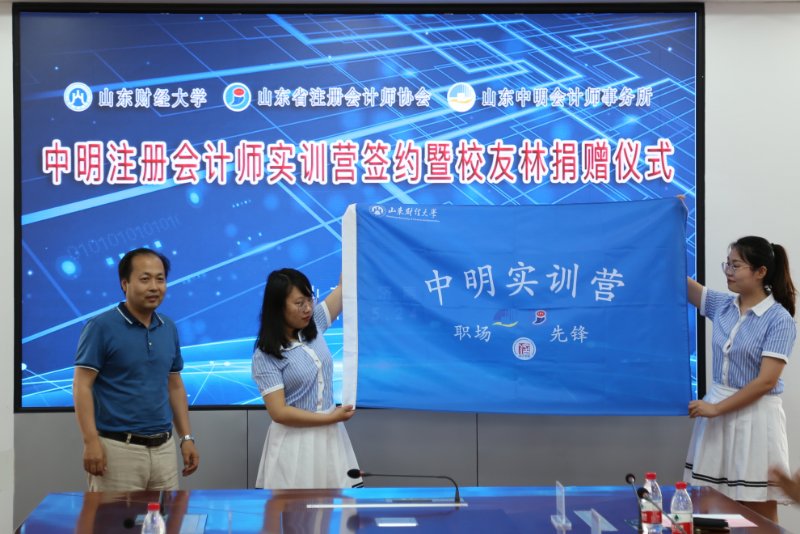 山东省注册会计师协会常务理事、山东中明会计师事务所董事长巴树青在致辞中首先对前来参加开营仪式并给予活动大力支持和指导的各位领导和老师表示感谢,巴树青对山东中明公司各个专业公司的基本情况和办公场所的设置情况进行了简要的介绍,并指出设立中明实训营的目的一是为了宣传注会行业,让社会更多的了解这个行业;二是为有志于从事注会行业的广大学子创造提前介入实践的机会;三是为山东省注册会计师行业及我公司培养后备人才打下坚实基础。巴树青说,坚信有学校领导和老师们的大力支持和理论保障、有省注协作为行业主管单位的业务指导和支持、有中明会计师事务所各注册会计师的热情参与和实践指导,我们的实训营活动一定会达到预期目的,将各位注会行业爱好者早日培养成合格的、坚定的执业注册会计师,为山东省注册会计师行业培养一批后备人才,为注册会计师事业做出应有的贡献!巴树青最后表示,为感谢母校领导和老师对他本人和山东中明30余位山东财大校友的培养。为感谢山东财经大学历届领导对山东中明各公司的关心、支持和帮助,山东中明公司决定向山东财经大学无偿捐赠人民币壹拾万元用于学校主校区“中明园校友林”建设。
