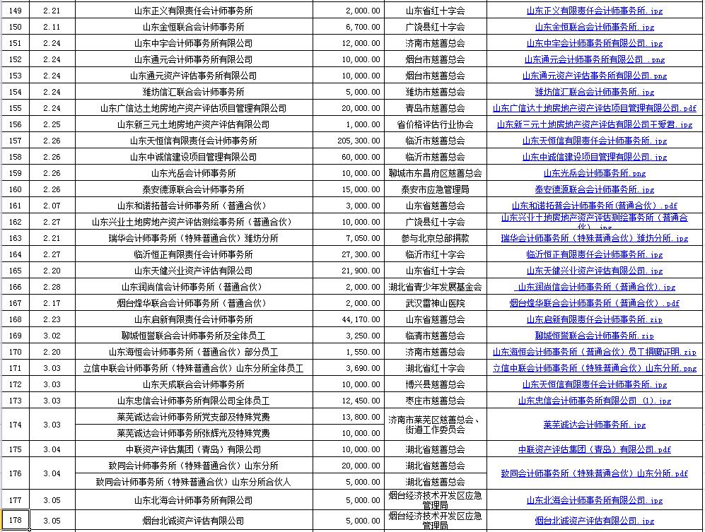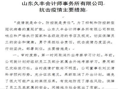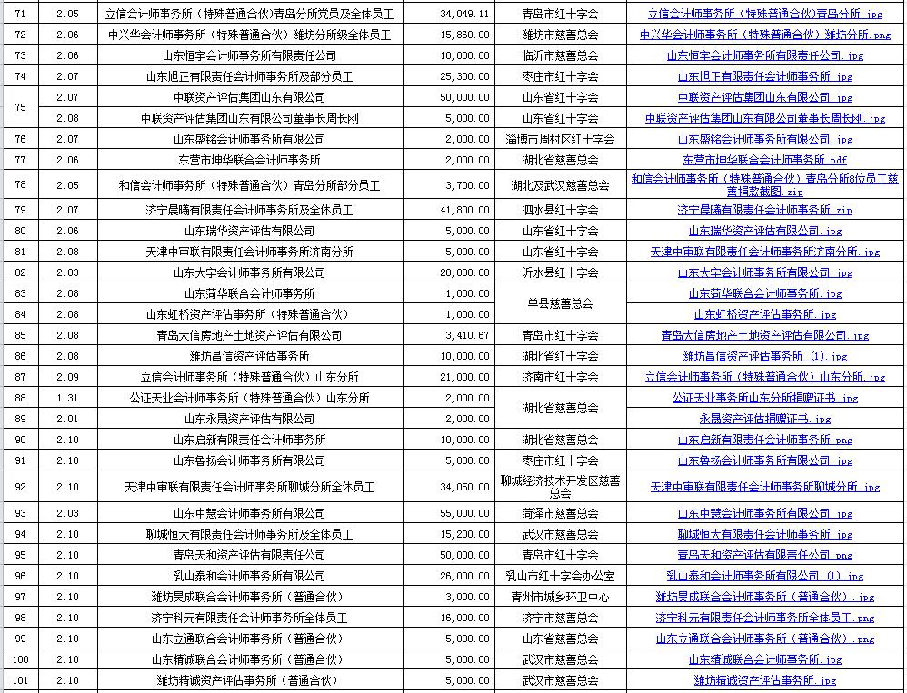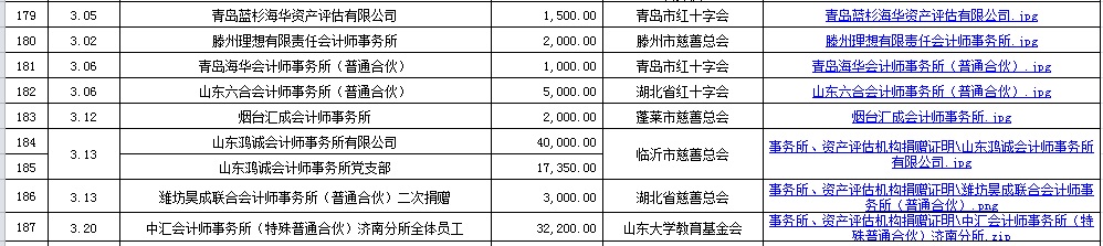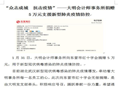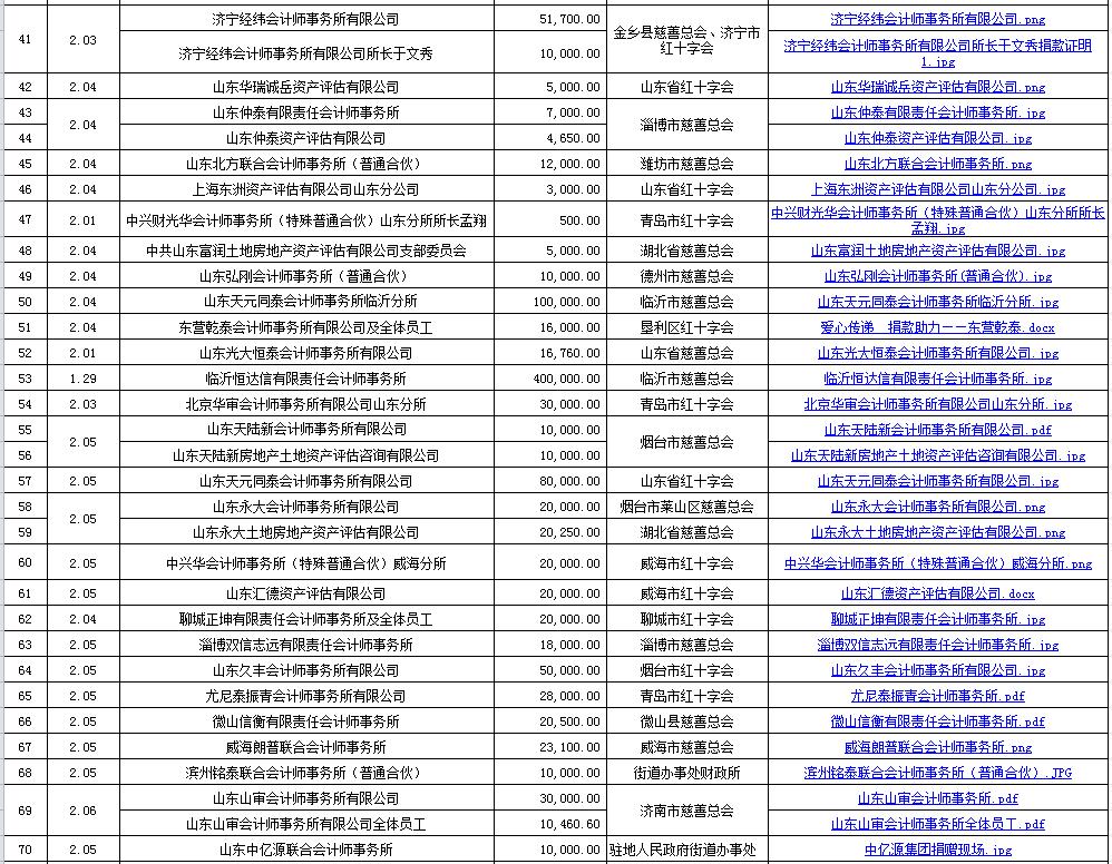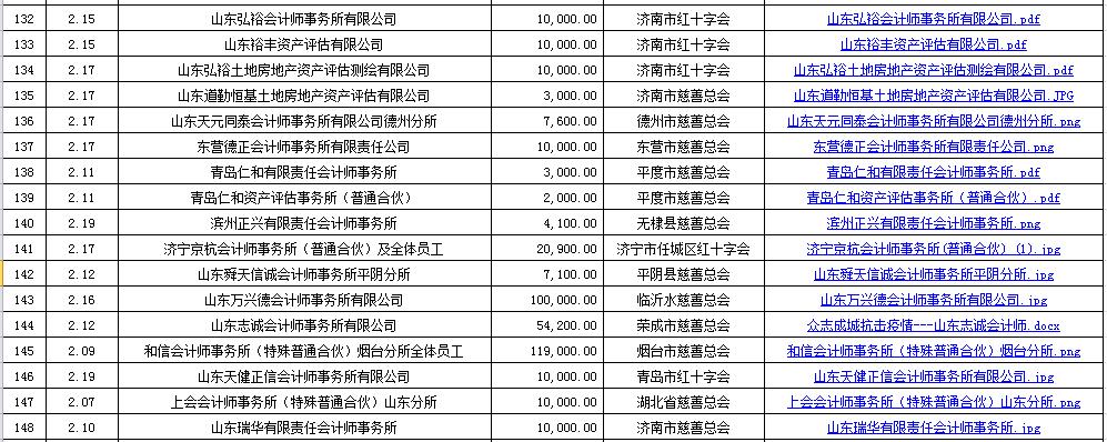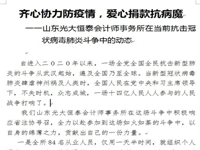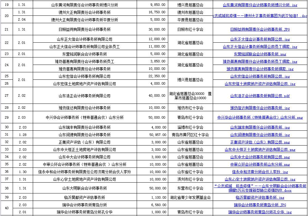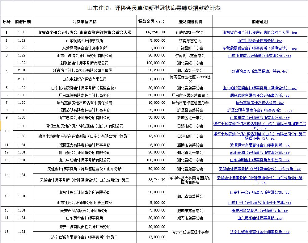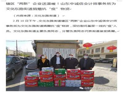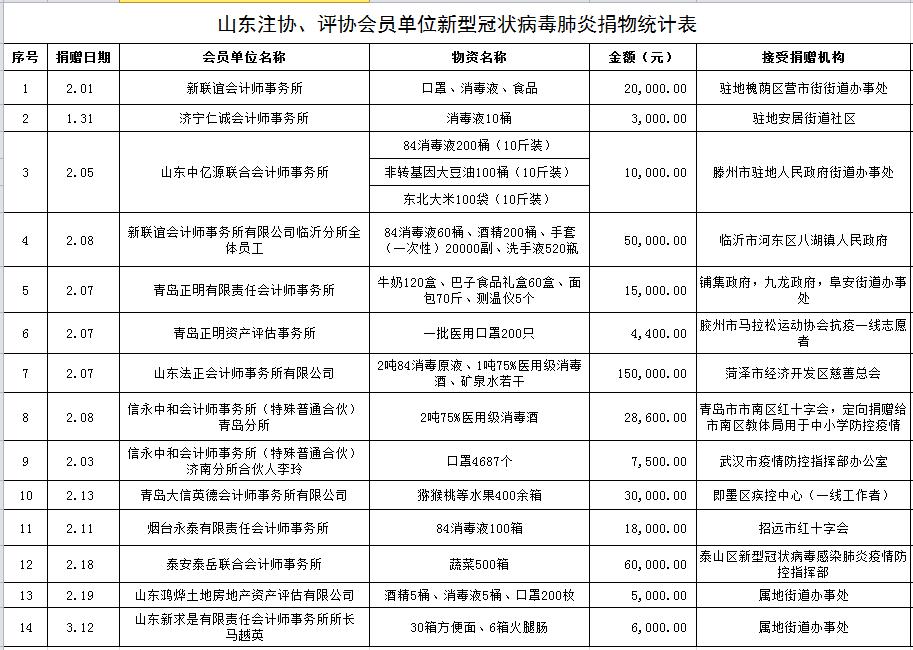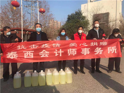 大爱无声,勠力同心。疫情发生后,协会广大会员及从业人员或是捐款,或是捐物,用各种实际行动践行责任与担当。据悉,新联谊会计师事务所第一时间成立新型冠状病毒疫情防控小组,全力做好自身疫情防控工作,继向湖北省红十字会捐款后,向驻地街道社区捐赠口罩、消毒液、食品、营养品等2万元物资。山东长恒信会计师事务所按照济宁市注册会计师行业党委成立社区疫情防控突击队的通知,立即组织各支部报名,党员们积极踊跃,争先恐后报名。李志文所长大清早就亲自到所在社区大门口执勤,顶班上岗。威海永然会计师事务所作为法财税融合联合体的总服务商,除捐款捐物外,积极发挥自身优势,通过对会员单位延长会期的方式,切实服务威海企业,总贡献值达50余万。疫情就是命令,为了配合政府做好新型肺炎的防御、加快防御设施建设,济宁仁诚会计师事务所部分员工不顾个人安危,提前结束假期,加班加点投入相关服务工作,事务所除了组织捐款外还向当地街道捐赠约3000元消毒液等物资。山东大明会计师事务所深入贯彻落实省注协、市疫情防控指挥部的各项决策部署,全面启动消毒及排查工作,统一购置近千个有效防护口罩,供员工及家人领取使用;通过微信群平台,号召全体员工众志成城,抗击疫情,党员带头随时宣传相关法律法规,用实际行动发挥党员的先锋模范作用,确保疫情防控落实落细。山东久丰会计师事务所有限公司号召全体员工严格遵守“上班地点在家里,工作任务是学习”的公司规定。1月31日,党支部书记刘兰清带领支部部分党员与女企业家商会部分代表,走访慰问战斗在防疫一线的交通监察执法大队工作人员,为他们送去了价值4000元的方便面、喜旺熟食、牛奶等生活物资。临沂恒达信有限责任会计师事务所党支部安排专人专责关注汇报疫情动态,1月26日(大年初二)紧急作出《响应中央号召,抗击疫情,恒达信人在行动》抗击新冠病毒捐款决定和募捐倡议,决定捐款40万元用于抗击疫情防控,并连夜联系临沂市慈善总会,分别于1月27日、29日将30万元、10万元汇入总会账户。山东法正会计师事务所有限公司通过多日多方筹集,将价值15万元的2吨84消毒原液、1吨75%医用级消毒酒以及方便面、矿泉水共四车疫情抗击物资送到菏泽市开发区管委会,奉献企业爱心,彰显社会责任。聊城华越有限责任会计师事务所所长李广源带头响应协会号召,在个人捐款20000元的同时,还向员工提供自己冬天储存的白菜,时刻关心关注员工居家隔离期间的生活,充分发挥了一名优秀共产党员的先锋模范作用。