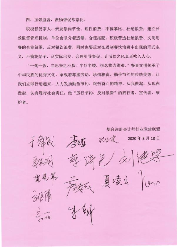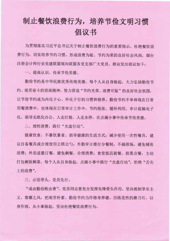 为贯彻落实习近平总书记关于制止餐饮浪费行为的重要指示,切实培养节约习惯,烟台市注册会计师行业党建联盟于2020年8月向联盟各党支部广大党员、群众发出制止餐饮浪费行为,培养节俭文明习惯的倡议。