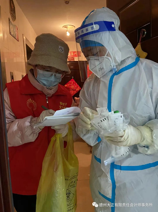 德州大正会计师事务所党支部支援者志愿者张建伟、李婷不畏降温大风的极端严寒天气,协助医护人员、社区干部一直忙到深夜11点才结束工作。