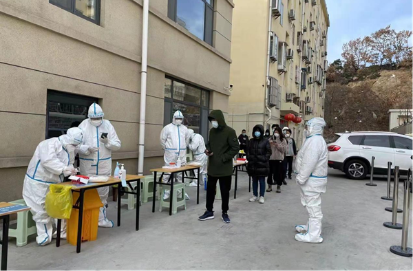 山东志诚会计师事务所志愿者赵珩臣、张佳惠响应号召,主动请缨,身穿厚重的防护服,参加和谐家园小区和古寨西路核酸检测单志愿服务工作。