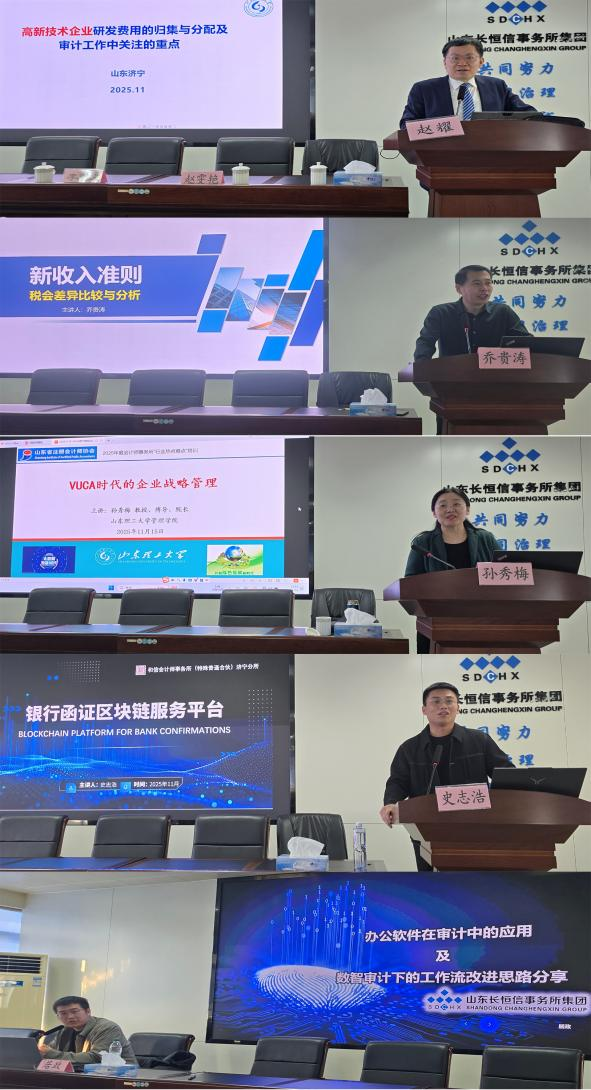 本次培训特邀山东理工大学管理学院三位资深教授授课。赵耀教授围绕高新技术企业研发费用归集与分配实务焦点,结合审计重点难点深入剖析;乔贵涛教授系统梳理新收入准则下税会差异,结合案例细致解析;孙秀梅院长聚焦VUCA时代(易变性、不确定性、复杂性、模糊性)行业变革,解析企业战略管理核心逻辑与应对策略。此外,和信会计师事务所济宁分所两位高级经理,演示讲解自主研发的智能化审计工具及银行电子函证等实用技巧,让学员对新技术提升审计效率与质量有了直观认知。